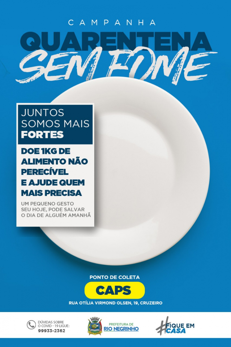 A Prefeitura de Rio Negrinho está lançando a campanha “Quarentena sem Fome”, que visa arrecadar alimentos para famílias que estejam passando por dificuldades nesse momento. A ação também visa atender famílias que não são assistidas pelos programas da Secretaria de Assistência Social.
