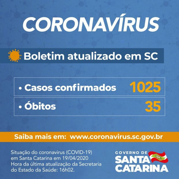 O Governo de Santa Catarina informou que há registro de 1.025 casos confirmados de infecção pelo novo coronavírus. O dado foi divulgado pelo governador Carlos Moisés neste domingo, 19. A Covid-19 já causou 35 mortes no estado desde o início da pandemia. Os óbitos mais recentes são de três homens, residentes em Braço do Norte (37 anos), Camboriú (68) e Tangará (56). Todos faziam parte de grupo de risco. |