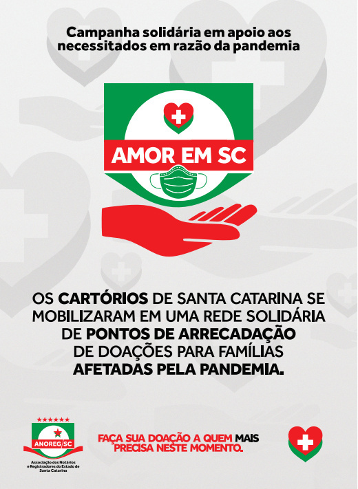 Os cartórios catarinenses acabam de lançar a campanha “Amor em SC”, para arrecadar donativos para famílias carentes e em auxílio de instituições que estão realizando doações para amenizar a vulnerabilidade financeira dos cidadãos mais atingidos pela crise decorrente da pandemia do Coronavírus. A iniciativa aproveita a capilaridade das serventias extrajudiciais para funcionarem como postos de coleta: são mais de 600 cartórios no Estado, e há unidades em todos os municípios.
