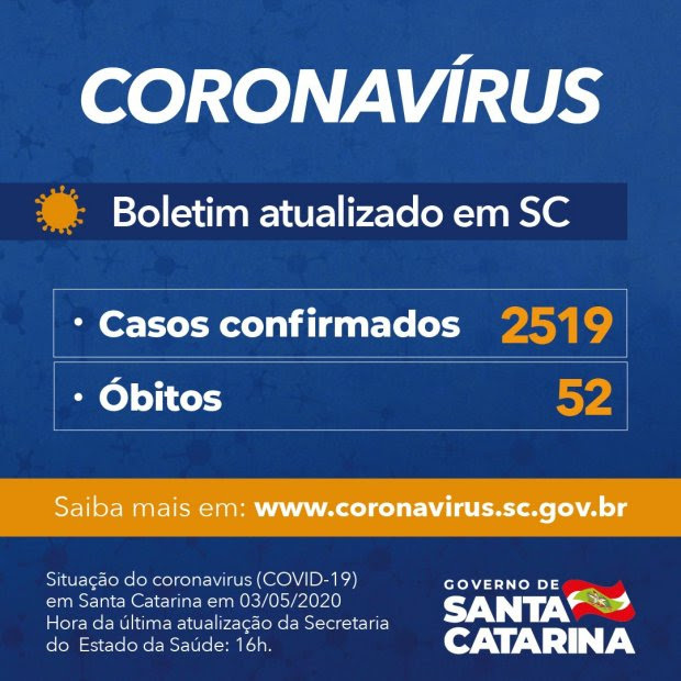 O Governo do Estadoinforma que há 2.519 casos confirmados de Covid-19 em Santa Catarina. O balanço foi divulgado neste domingo, 3. O novo coronavírus causou 52 óbitos no estado desde o início da pandemia.