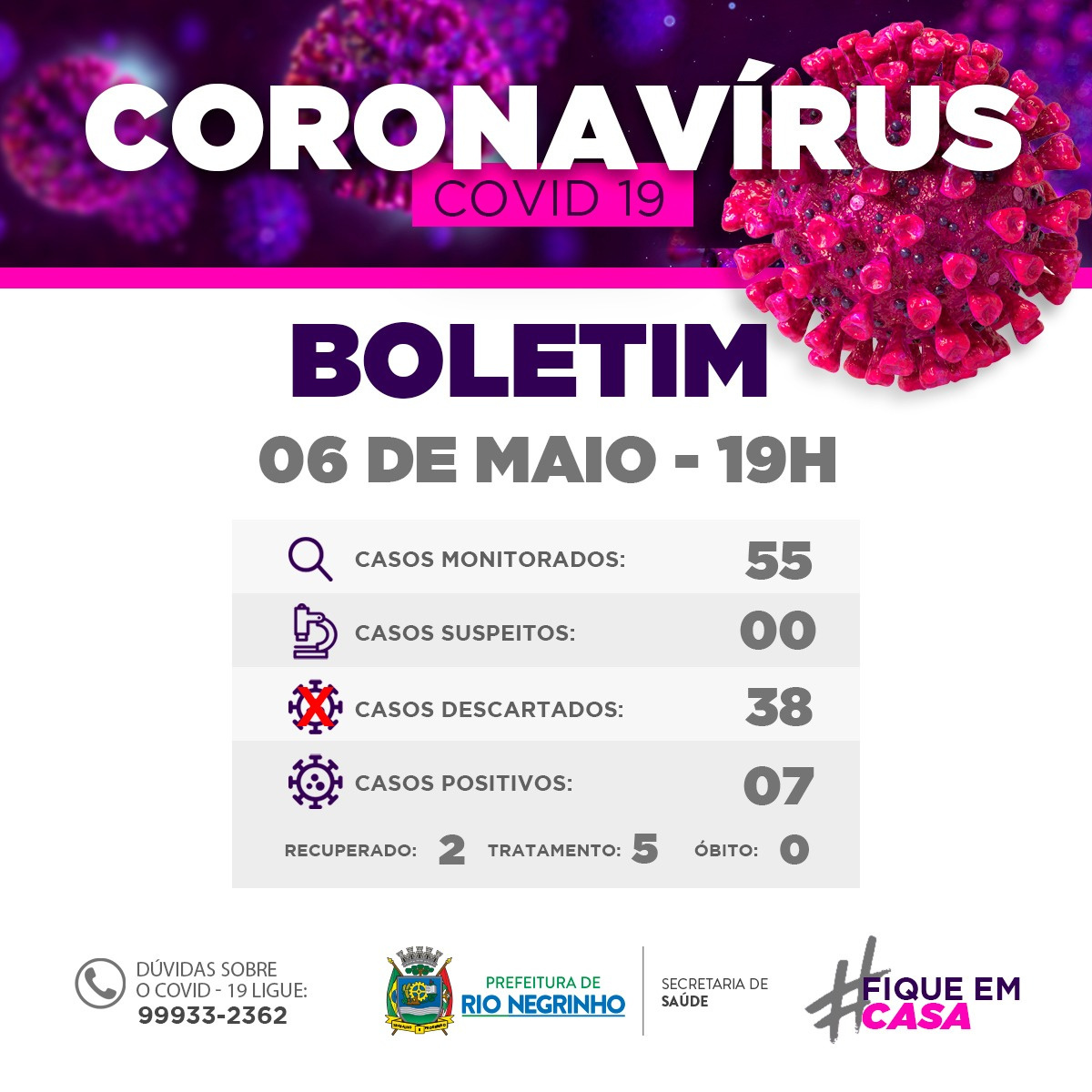 Nesta terça-feira, dia 6 de maio, Rio Negrinho teve confirmado mais dois casos de coronavírus (Covid-19). Com isso, chegam a sete o número de pessoas já contaminadas que residem na cidade. Desse total, dois já estão totalmente recuperados, quatro apresentam sintomas leves da doença e estão isolados em suas casas, e um tem um quadro mais grave, estando internado na UTI e entubado, além de apresentar secreção nos pulmões.