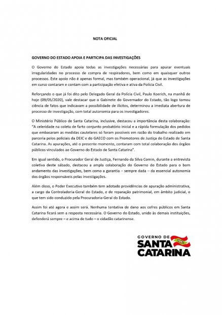 Reforçando o que já foi dito pelo Delegado Geral da Polícia Civil, Paulo Koerich, na manhã de hoje (09/05/2020), vale destacar que o Gabinete do Governador do Estado, tão logo tomou ciência de fatos que indicavam a possibilidade de ilícitos, determinou a imediata abertura de processo de investigação, com total autonomia para os investigadores.