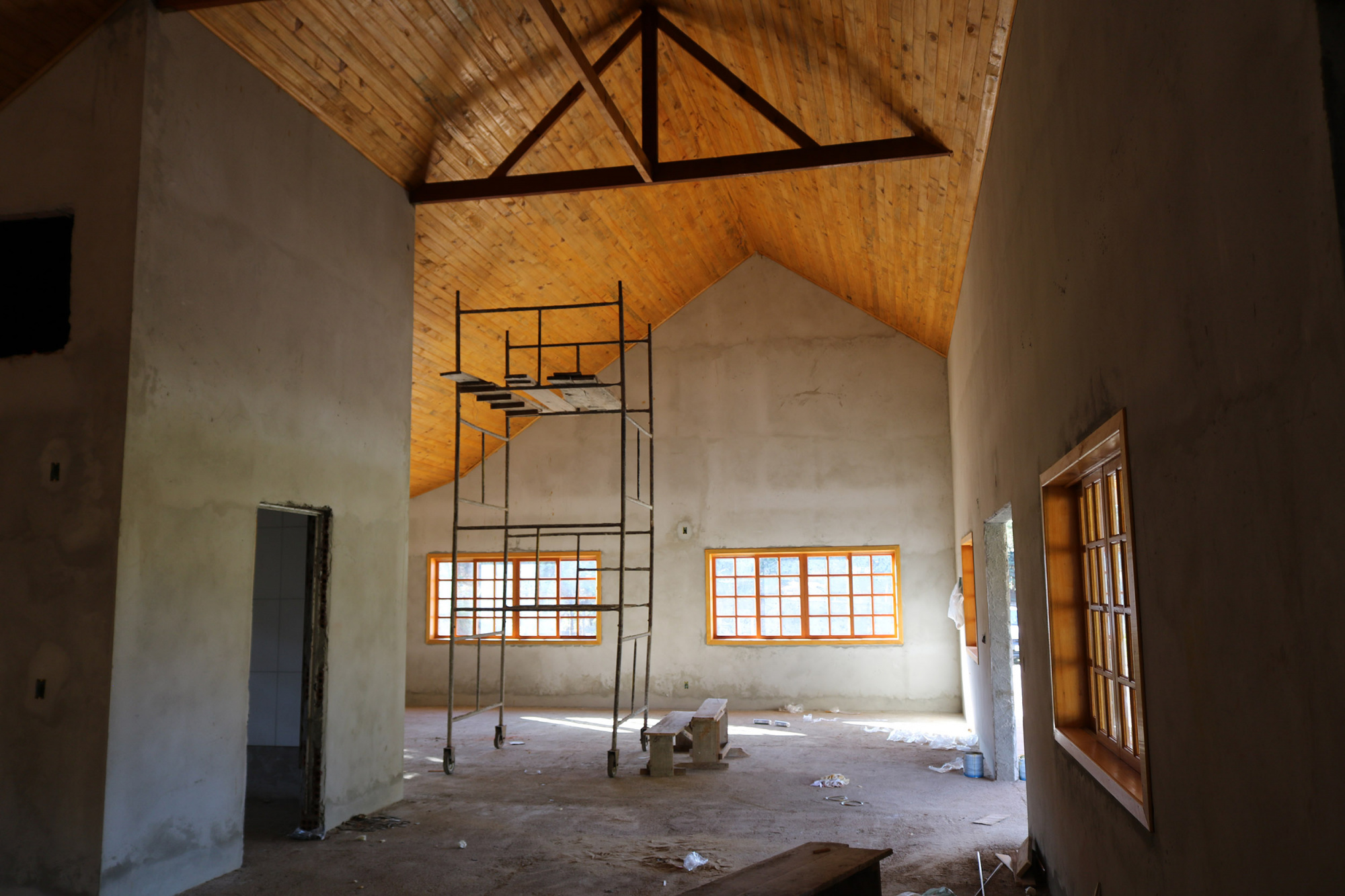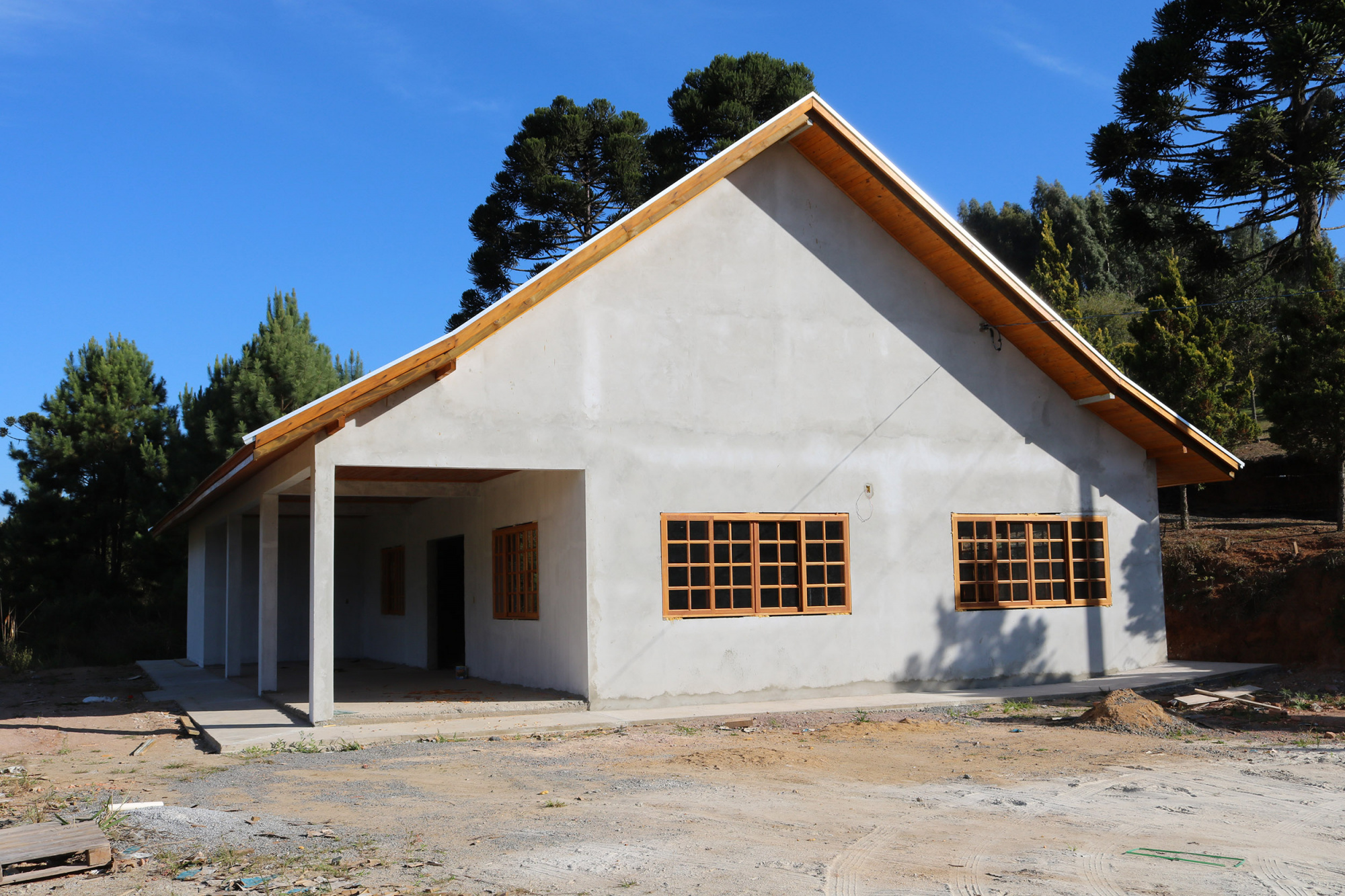 Para que seja totalmente concluída, restam ainda a pintura externa, instalação do piso cerâmico, instalação das portas, louças dos banheiros e balcão com pia na copa.