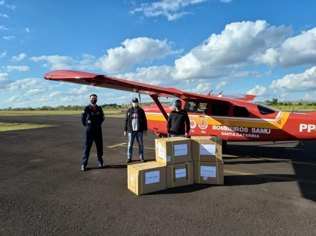 O material, usado como estratégia de combate da Covid-19 em Santa Catarina, foi transportado pelos aviões Arcanjos 02 e 04 dos Bombeiros.
