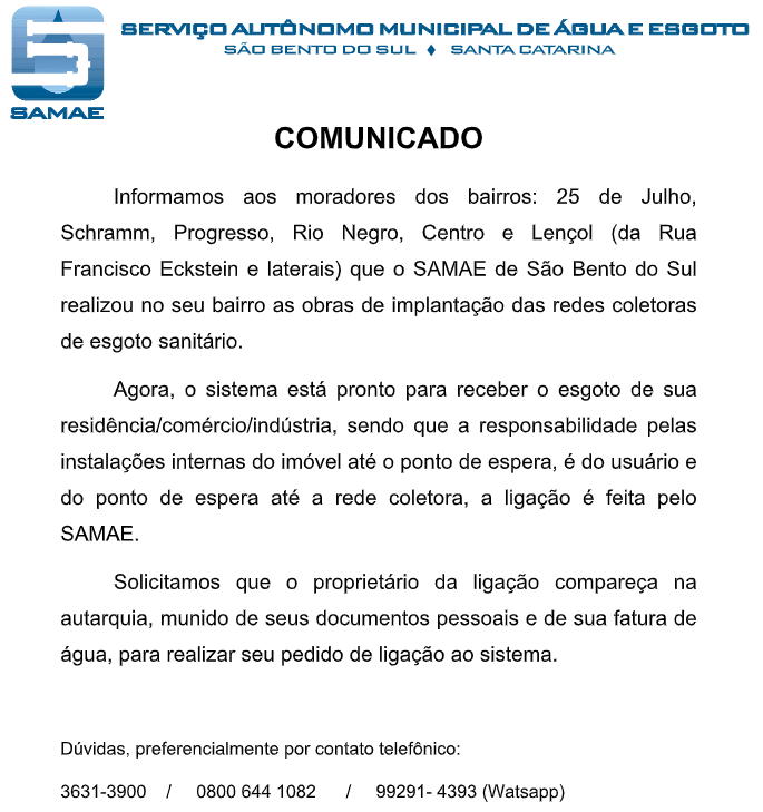 Informamos aos moradores dos bairros: 25 de Julho, Schramm, Progresso, Rio Negro, Centro e Lençol (da Rua Francisco Eckstein e laterais) que o SAMAE de São Bento do Sul realizou no seu bairro as obras de implantação das redes coletoras de esgoto sanitário.