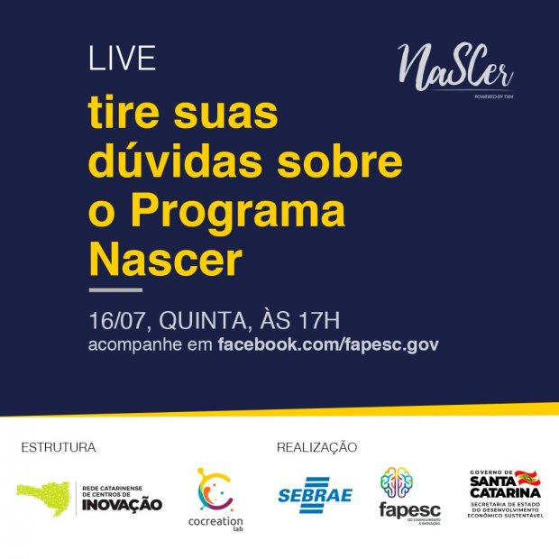 Faltando menos de uma semana para encerrarem as inscrições para a segunda edição do Programa Nascer, a Fundação de Amparo à Pesquisa e Inovação de Santa Catarina (Fapesc) vai fazer uma live para tirar as últimas dúvidas dos candidatos. A transmissão será feita na página da fundação no Facebook nesta quinta-feira, 16, às 17h.