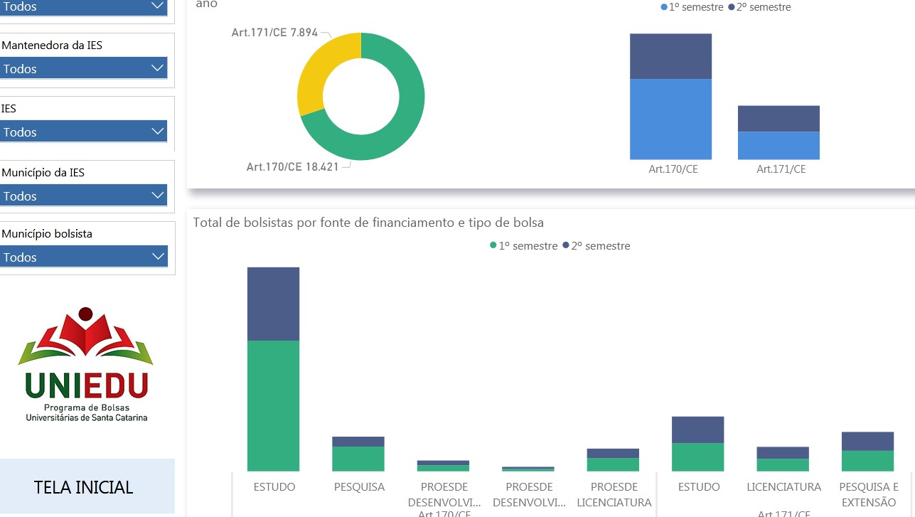 disponibilizou um painel para acesso público com diversos dados sobre Programa de Bolsas Universitárias de Santa Catarina (Uniedu). A ferramenta permite verificar os números de estudantes cadastrados, bolsistas e investimentos em cursos de graduação e pós-graduação, além de informações por municípios e instituições de ensino superior. Os dados do ano atual são atualizados diariamente por conta das interações entre estudantes e instituições de ensino.