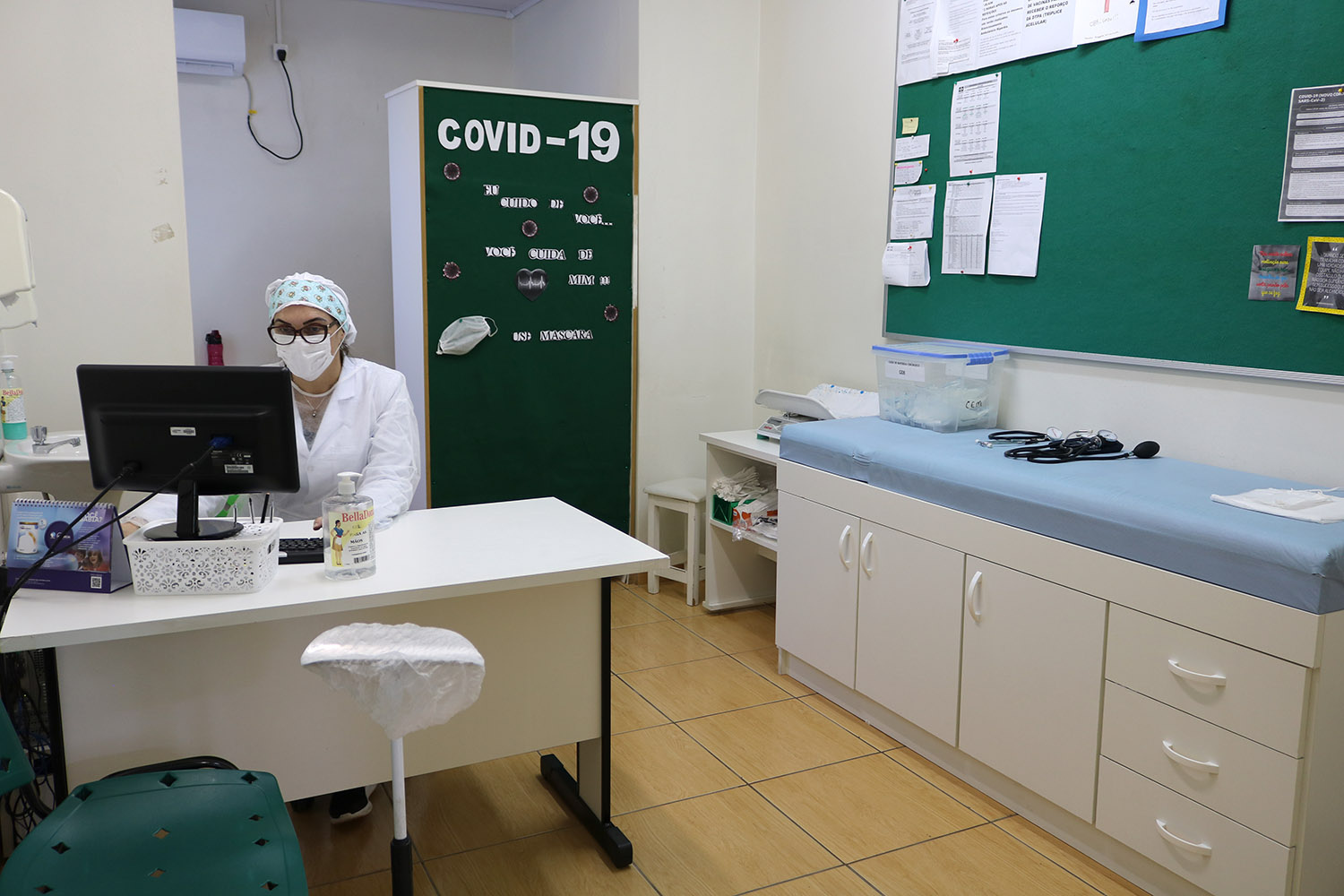 No lado de fora foi disponibilizado álcool em gel e na porta a pessoa é abordada e encaminhada para a sala de triagem, caso seja para uma consulta médica, ou para a sala de vacinas ou área de odontologia. Vale destacar que a temperatura de todas as pessoas é verificada com a utilização de um termômetro de testa, do tipo pistola.