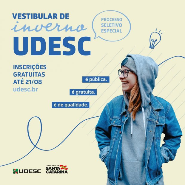 O prazo para se inscrever é até 21 de agosto. Confira mais detalhes no edital e no Guia de Cursos Udesc. A universidade fará um processo seletivo especial neste Vestibular de Inverno devido à impossibilidade de realizar provas presenciais durante a pandemia de Covid-19.