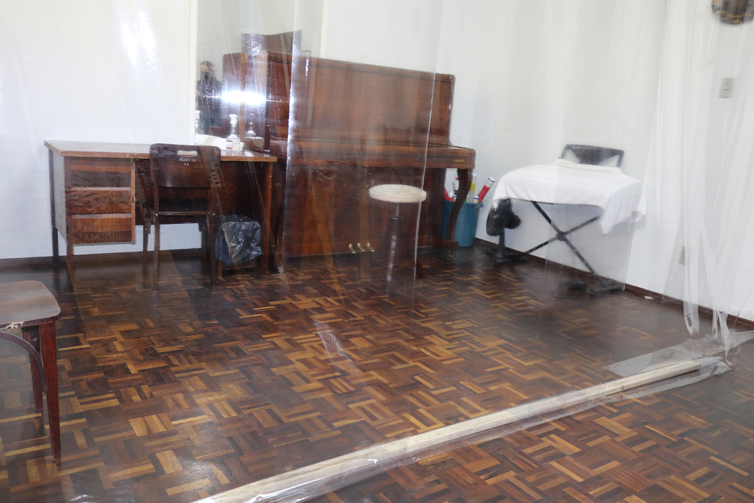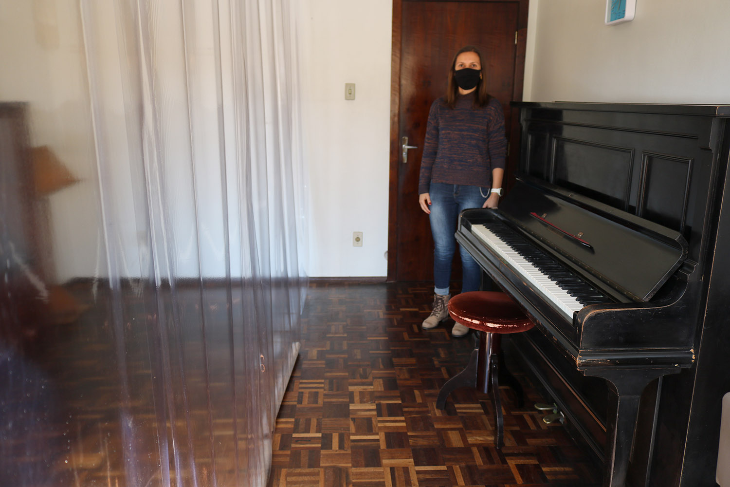 Nos casos em que instrumentos não podem ser emprestados, como pianos, bateria, baixo ou violoncelo, Maria Luisa explicou que a escola preparou salas especiais para estas aulas, onde o espaço foi dividido em dois ambientes com a utilização de uma cortina plástica, que forma uma barreira evitando o contato entre professor e aluno.