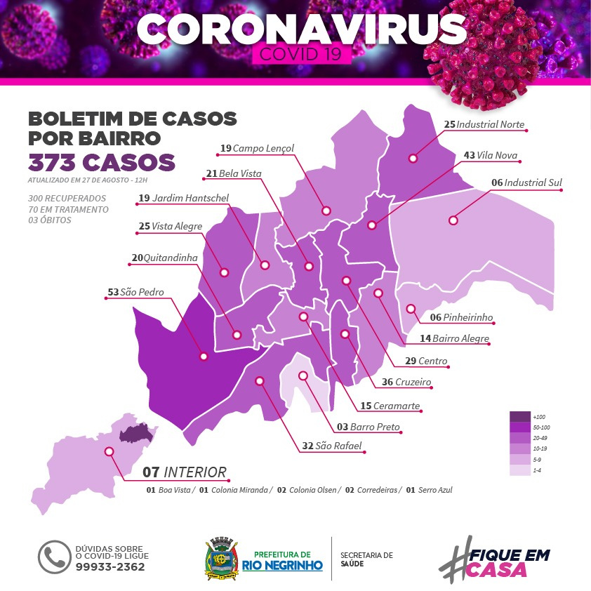 Nesta quinta-feira, dia 27 de agosto, Rio Negrinho teve a confirmação de mais um caso de coronavírus. Com isso, o total de infectados passa a ser de 373 pessoas. Desse total, 300 estão recuperados e 70 estão em tratamento. Rio Negrinho ainda registra três óbitos confirmados em decorrência do coronavírus.