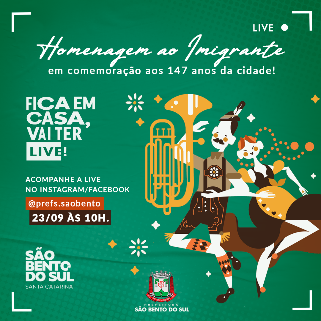 No próximo dia 23, São Bento do Sul completa seus 147 anos de história e, para não deixar esse momento tão importante passar em branco, devido a pandemia, a Prefeitura de São Bento do Sul, por meio da Fundação Cultural e Departamento de Comunicação, irá realizar uma transmissão ao vivo pelas redes sociais, em substituição as tradicionais homenagens realizadas anualmente.