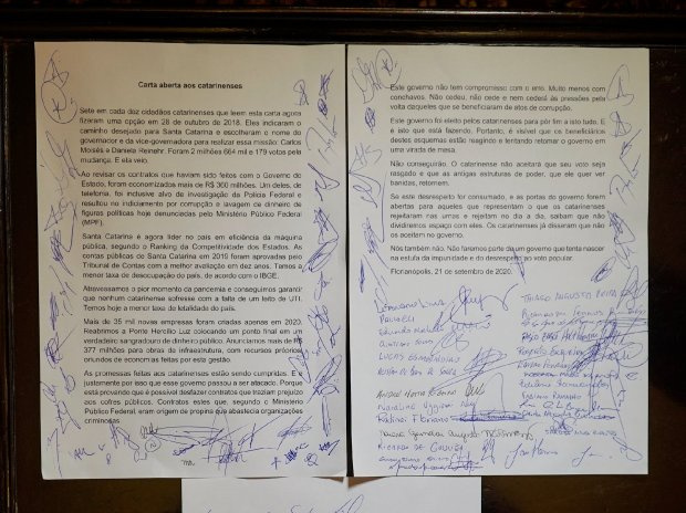 Na carta, os secretários e presidentes afirmam que “o governo não cedeu, não cede, nem cederá às pressões pela volta daqueles que se beneficiaram de ato de corrupção”. O documento finaliza com o seguinte trecho: “Se este desrespeito for consumado, e as portas do governo forem abertas para aqueles que representam o que os catarinenses rejeitaram nas urnas e rejeitam no dia a dia, saibam que não dividiremos espaço com eles. Os catarinenses já disseram que não os aceitam no governo”.