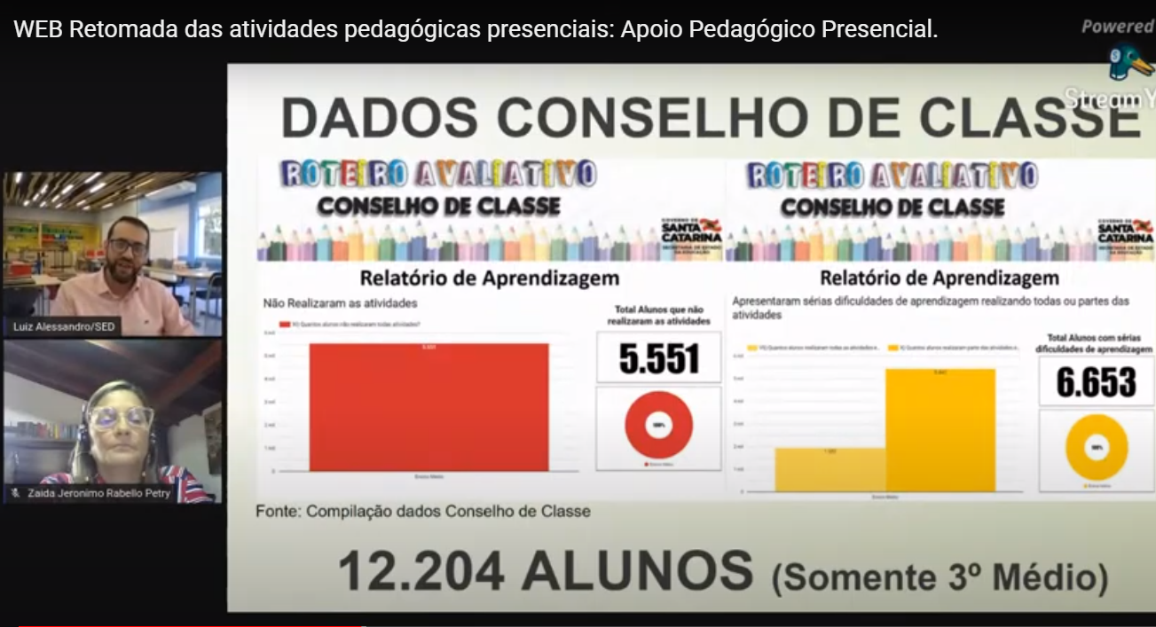 A Secretaria de Estado da Educação (SED) realizou uma transmissão em vídeo no YouTube para mais de 4 mil servidores da rede estadual de ensino de Santa Catarina, incluindo os diretores das 1.065 escolas estaduais, nesta segunda-feira, 5. O tema do encontro foi a retomada das atividades presenciais, explicando como deverá funcionar o Apoio Pedagógico Presencial, com cronograma de atividades para professores, alunos e as medidas a serem tomadas. As aulas presenciais só retornam em 2021 na rede estadual, mantendo-se até o final do ano letivo as atuais atividades escolares remotas.