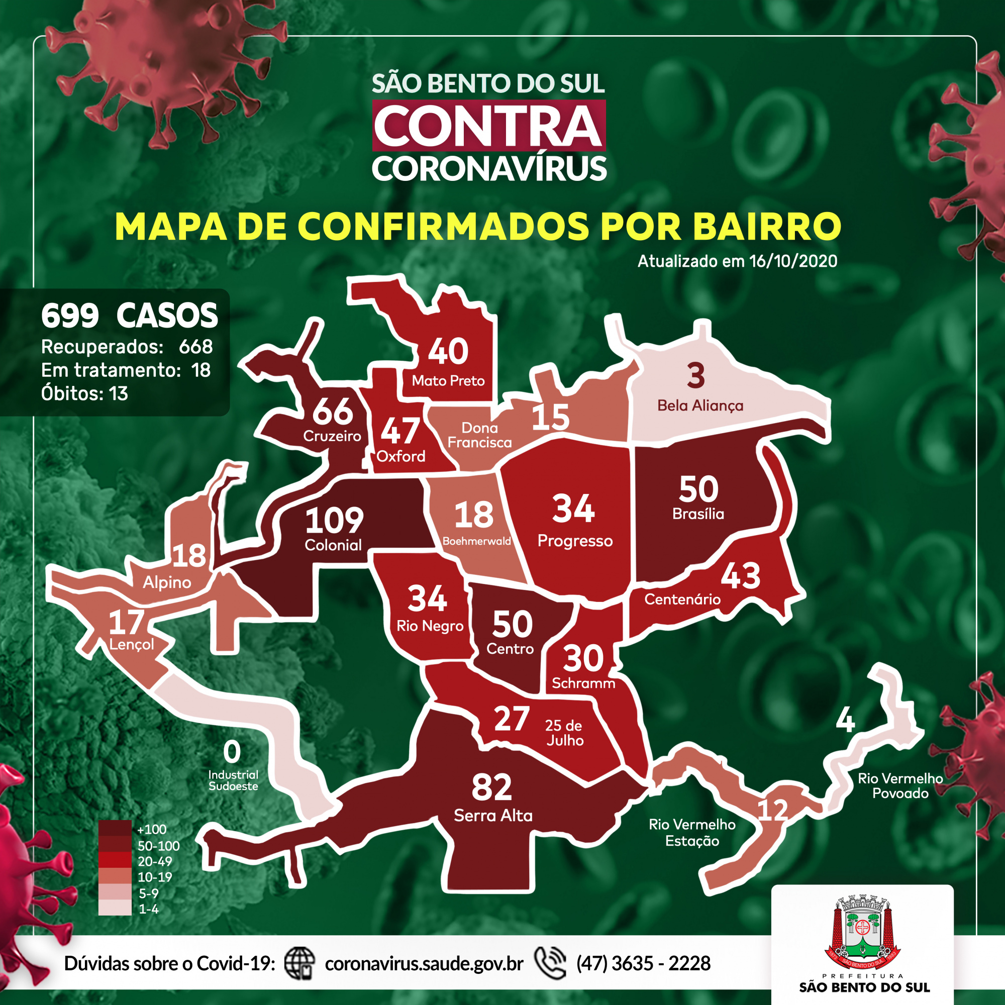 O mapa apresenta os dados atualizados até o dia 16 de outubro, totalizando até o momento, 699 casos de coronavírus na cidade. Destes, 668 já estão recuperados, 18 em tratamento e 13 óbitos.
