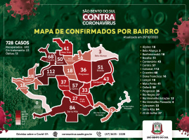 O mapa apresenta os dados atualizados até o dia 29 de outubro, totalizando até o momento, 728 casos de coronavírus na cidade. Destes, 692 já estão recuperados, 23 em tratamento e 13 óbitos.