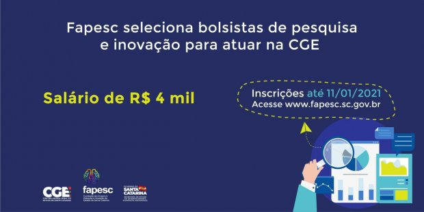 A Fundação de Amparo à Pesquisa e Inovação de Santa Catarina (Fapesc) abriu nesta quinta-feira, 10, duas chamadas públicas para a seleção de quatro bolsistas de pesquisa, desenvolvimento e inovação para atuar na Controladoria-Geral do Estado (CGE). Com bolsas no valor de R$ 4 mil e carga horária de 6 horas por dia, os pesquisadores irão desenvolver projetos nas áreas de Auditoria da Folha de Pagamento e de Transparência e Dados Abertos. O contrato valerá por um ano, prorrogável por mais 12 meses. As inscrições estão abertas até o dia 11 de janeiro de 2021 na plataforma de CTI da Fapesc. A divulgação dos aprovados será feita em 1º de fevereiro.