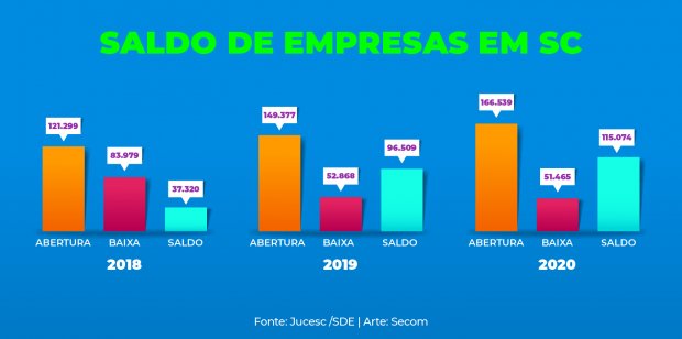 Mesmo com o impacto da pandemia da Covid-19 na economia, Santa Catarina segue firme com o perfil mais empreendedor do Brasil. E os números apresentados pela Junta Comercial (Jucesc), vinculada à Secretaria de Desenvolvimento Econômico Sustentável (SDE), nesta última quinta-feira (14), comprovam. Em 2020, o saldo de abertura foi de 115.074 novos empreendimentos, resultado 19% maior em relação ao mesmo período de 2019, que apresentou um saldo de 96.509 empresas.