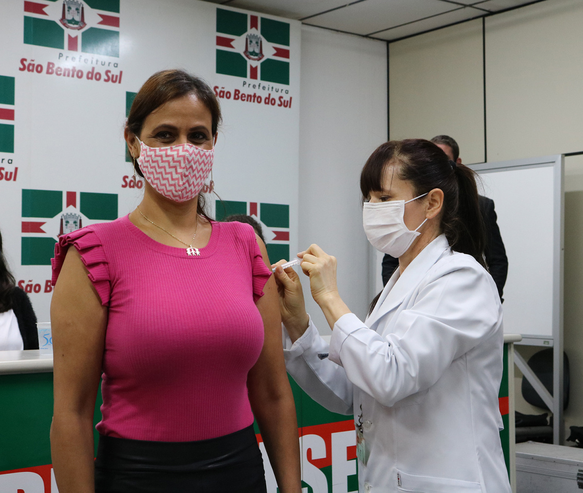 A enfermeira Sirlei Mara Leandro Gonçalves foi a primeira pessoa vacinada contra a Covid-19, em São Bento do Sul. A dose foi aplicada nesta quarta-feira (20) e faz parte da 1ª fase da campanha de imunização contra a doença.