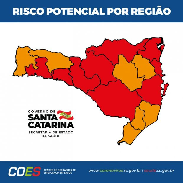 A Matriz de Risco Potencial, divulgada nesta quarta-feira, 20, pela Secretaria de Estado da Saúde (SES), classifica nove das 16 regiões de saúde catarinenses como em alerta gravíssimo (cor vermelha) para transmissão do novo coronavírus. No último boletim, publicado no dia 13, eram 13 as regiões no patamar mais alto para o risco de transmissão.