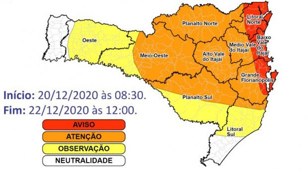 O Governo do Estado, por meio da Defesa Civil de Santa Catarina (DCSC), elevou o nível de alerta devido ao alto volume de chuva nas regiões do Planalto Norte, Litoral Norte e Vale do Itajaí. Nos últimos três dias, foram registrados volumes acima de 100 milímetros em 11 municípios, chegando a 207 em Garuva. Em caso de emergência, os catarinenses podem acionar a Defesa Civil pelo telefone 199 ou o Corpo de Bombeiros pelo 193.