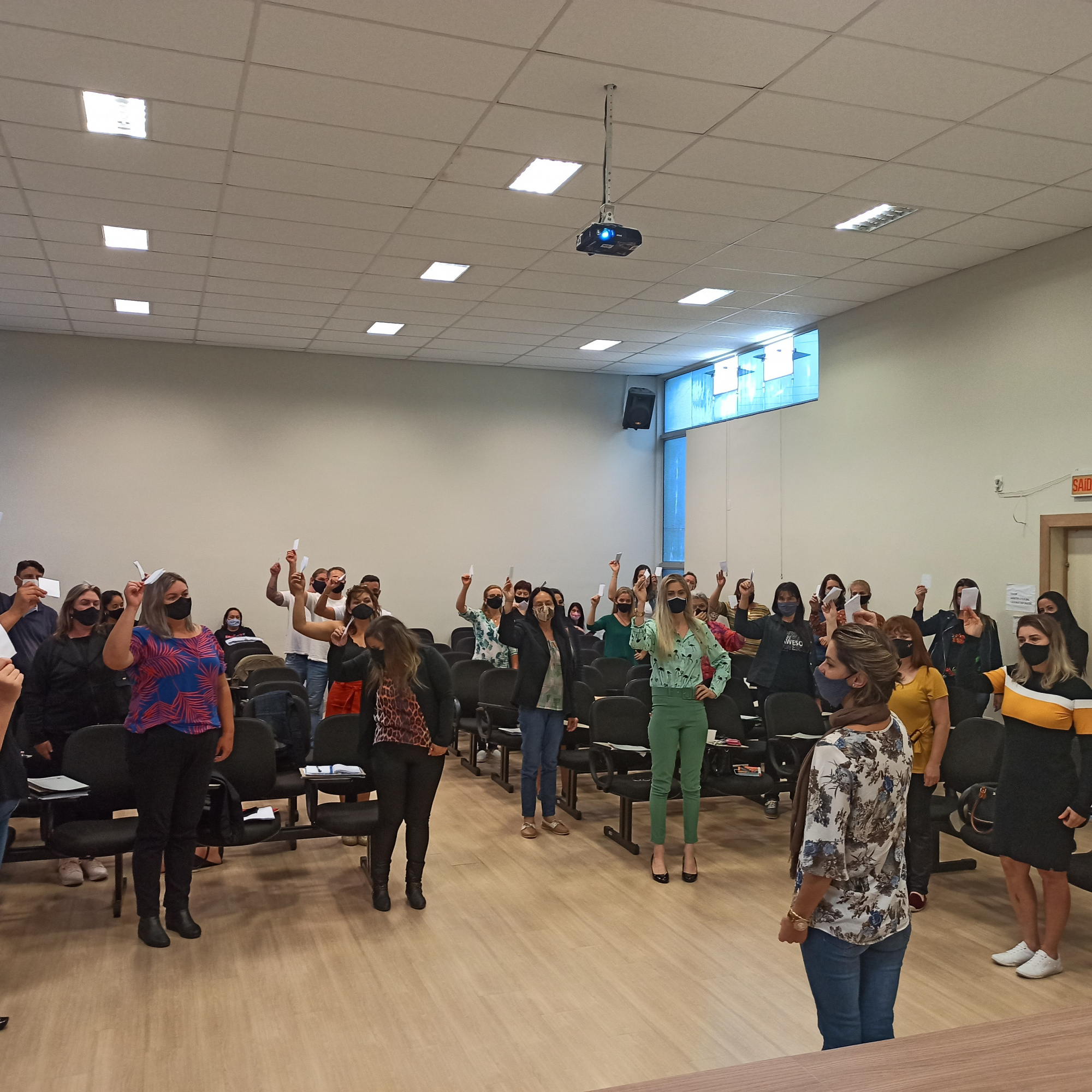 Antes das apresentações das equipes de trabalho da Secretaria Municipal de Educação, a Psicóloga Talita Pacheco Valério realizou dinâmica de grupo possibilitando aos gestores perceberem como se sentiam naquele dia, propiciando o autoconhecimento.