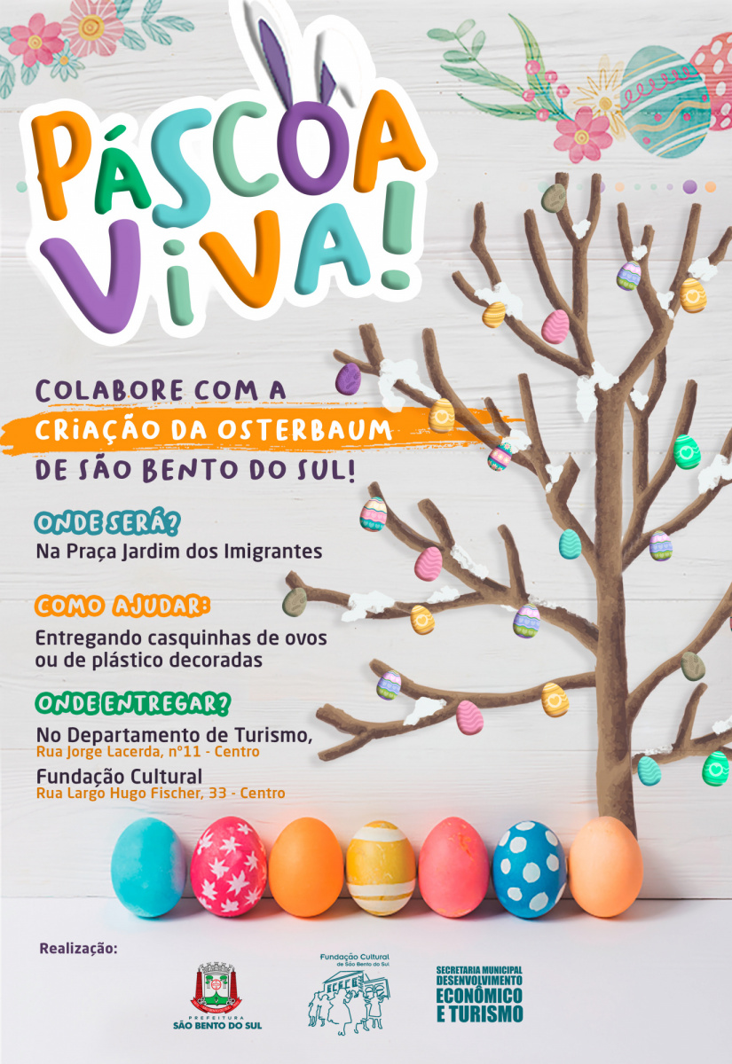 A Fundação Cultural de São Bento do Sul em parceria com o Departamento de Turismo está realizando a campanha “Páscoa Viva” onde a comunidade pode participar na doação de casquinhas naturais ou ovos de plásticos, para a criação de uma Osterbaum que será instalada na Praça Jardim dos Imigrantes.