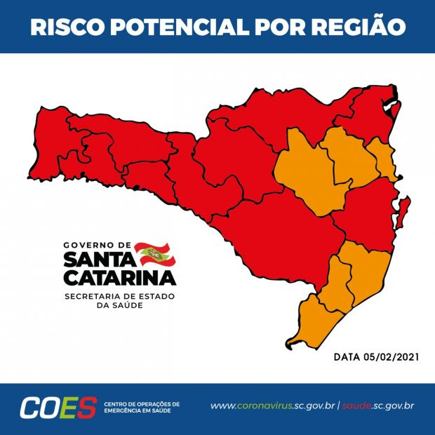 A Secretaria de Estado da Saúde (SES) divulgou neste sábado, 7, os dados da Matriz de Risco Potencial em relação ao novo coronavírus. Pela nova classificação, 10 regiões do estado se encontram em nível gravíssimo (cor vermelha) e seis regiões em nível grave (cor laranja), demonstrando um agravamento nos números.