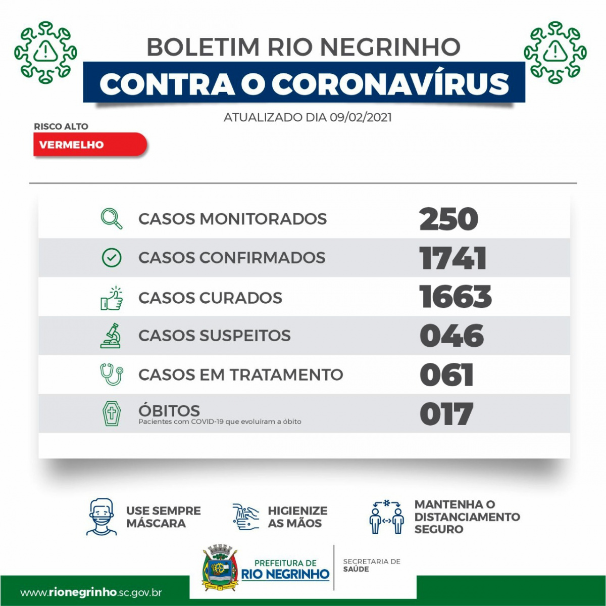 O município de Rio Negrinho registrou 11 novos casos de coronavírus nesta terça-feira. Com isso, já são 1741 confirmações da doença na cidade, além de 1706 casos descartados e 46 suspeitos. 250 pacientes estão em monitoramento, 61 seguem em tratamento e 1663 pessoas já estão recuperadas. São 17 óbitos em decorrência da Covid no município.