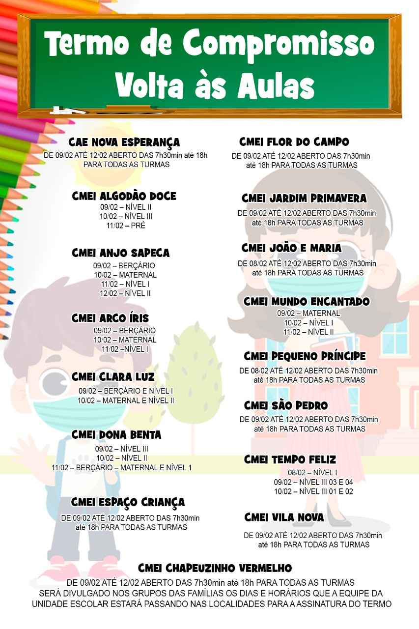 Todas as unidades escolares estarão abertas para receber as famílias nos horários das 7h30 às 18 horas sem fechar para o almoço, com prazo até sexta-feira (12). Confira nas imagens o horário, local e público destinado para cada unidade escolar.