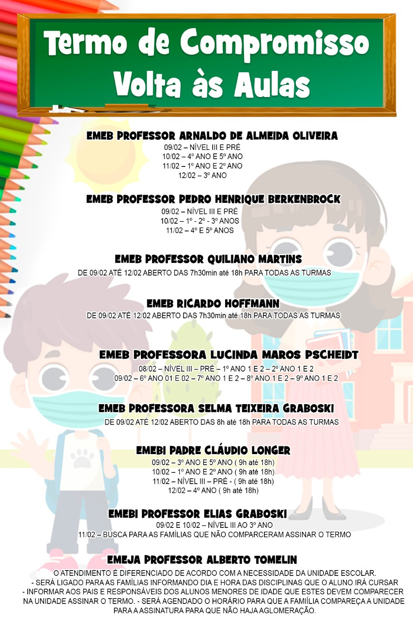 A Secretaria de Educação de Rio Negrinho informa que os pais ou responsáveis pelos alunos devem procurar as unidades escolares onde o estudante está matriculado. O motivo é o preenchimento do Termo de Compromisso, afirmando se o desejo da família é de que a criança frequente o ano letivo de maneira presencial ou remota.
