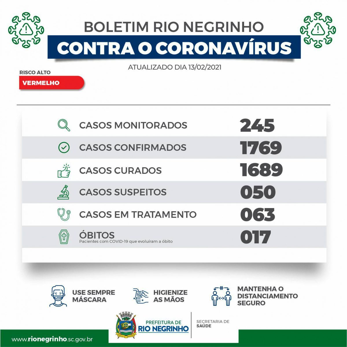 O município de Rio Negrinho registrou 16 novos casos de coronavírus neste sábado. Agora, são 1769 casos positivos, 1736 casos descartados e 1689 pessoas recuperadas.