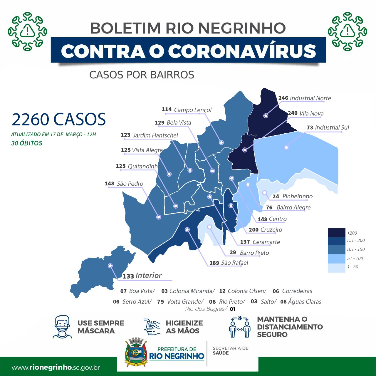 A Secretaria de Saúde de Rio Negrinho atualizou nesta quarta-feira o número de casos positivos de coronavírus por bairros. Com 23 novos casos nesta quarta, são 2.260 pessoas que contraíram a doença desde o início da pandemia.