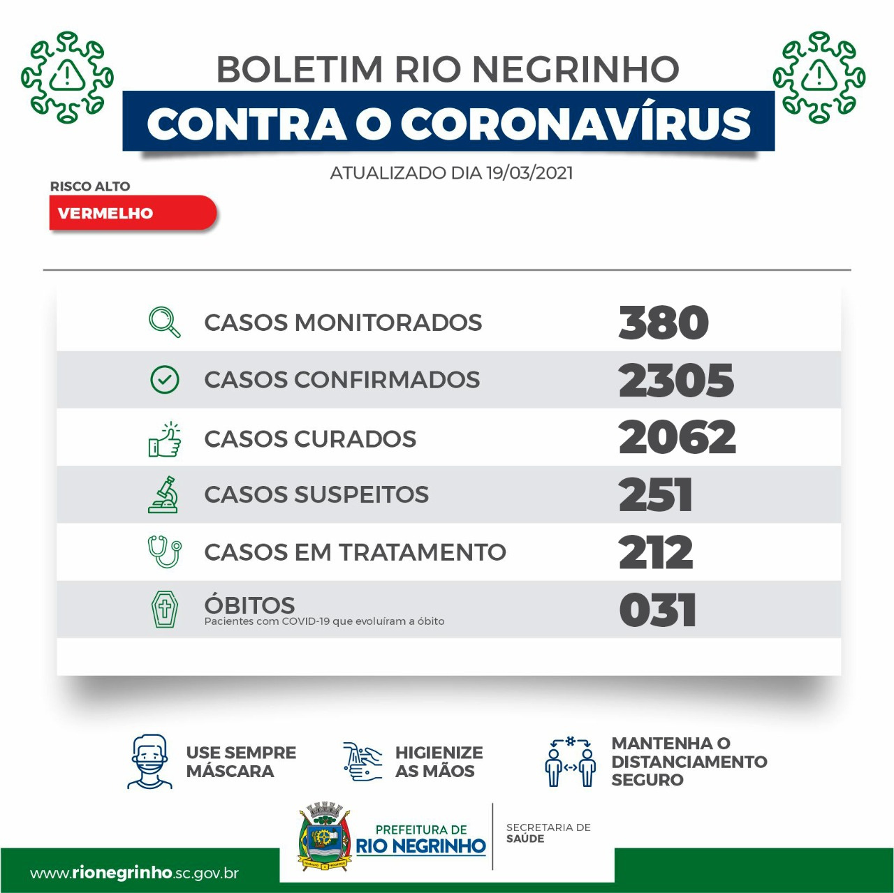 Rio Negrinho registra 21 casos e nova morte por Covid