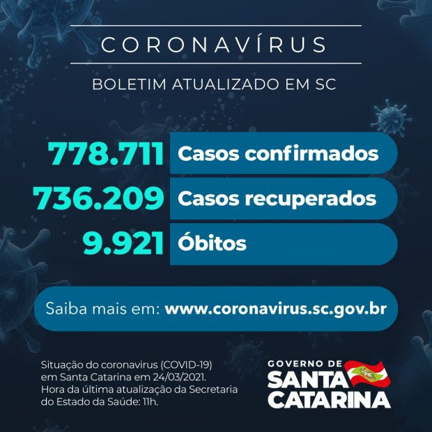 O Governo de Santa Catarina informou que há 778.711 pacientes com confirmação de infecção pelo novo coronavírus, dos quais 736.209 estão recuperados e 32.581 permanecem em acompanhamento. O número foi divulgado nesta quarta-feira, 24. A doença respiratória causou 9.921 óbitos no estado desde o início da pandemia. Esses números colocam a taxa de letalidade em 1,27%.
