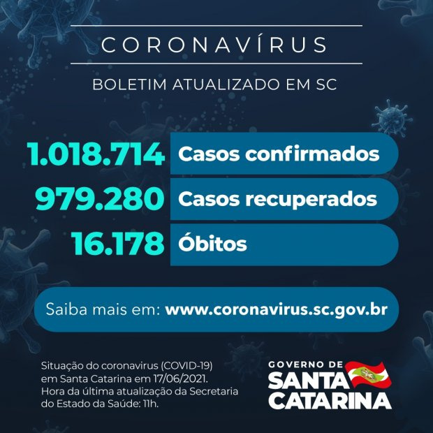 O Governo do Estado relatou que há um total de 1.018.714 casos confirmados de Covid-19 em Santa Catarina, dos quais 979.280 estão recuperados e 23.256 permanecem em acompanhamento. O número foi divulgado nesta quinta-feira, 17. O coronavírus causou 16.178 óbitos no estado até agora. A taxa de letalidade é de 1,59%.