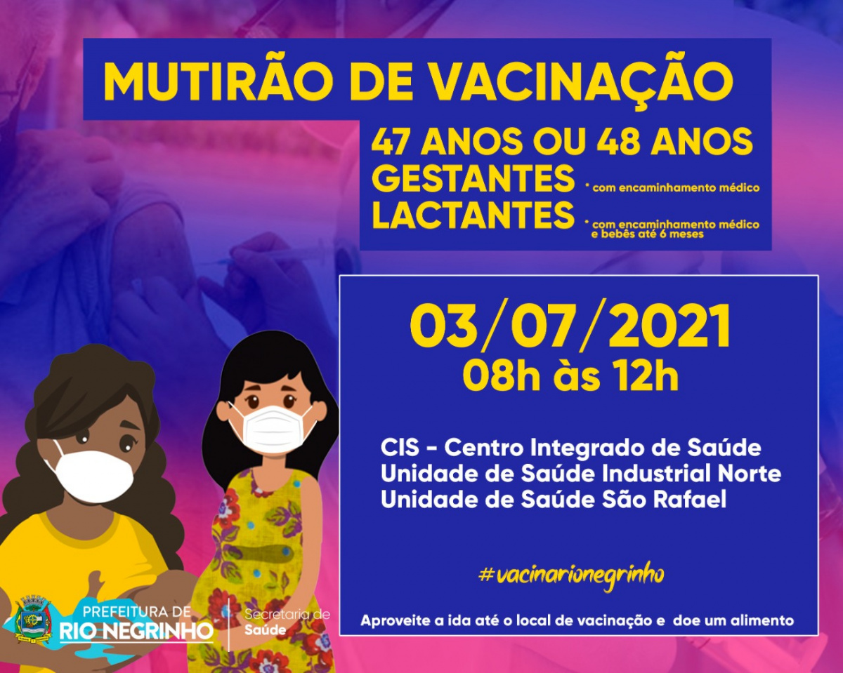 Neste sábado acontece mais um mutirão de vacinação contra a Covid em Rio Negrinho. A ação é destinada para os adultos acima de 47 anos, além das gestantes e lactantes (com bebês até seis meses). Para este último grupo, é indispensável apresentar encaminhamento médico. O Posto Central, do Industrial Norte e São Rafael estarão abertos das 8h às 12h! Aproveite a ida até o local de vacinação e doe um alimento.