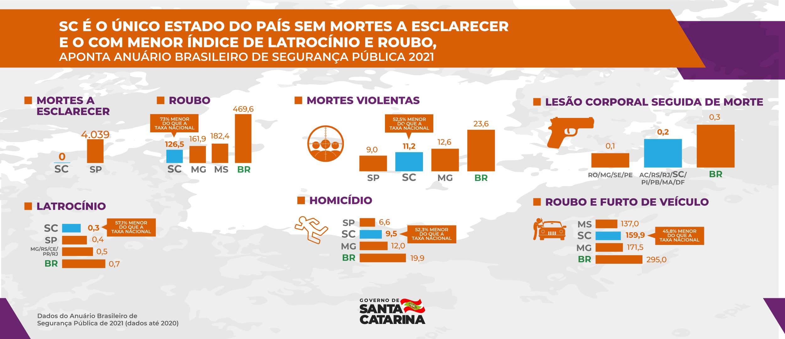 Santa Catarina aparece como o único estado do país que não tem nenhuma morte a esclarecer e, ainda, por possuir a menor taxa de latrocínio e roubo e a segunda menor taxa de morte violenta, homicídio, lesão corporal seguida de morte, roubo e furto de veículo. Os números reforçam os balanços realizados todas as semanas pelo Colegiado Superior de Segurança Pública e publicados todos os meses no site da Secretaria de Segurança Pública. Esses balanços apontam redução da incidênia de crimes violentos, como homicídio, e, também, de crimes como furto, roubo e latrocínio.