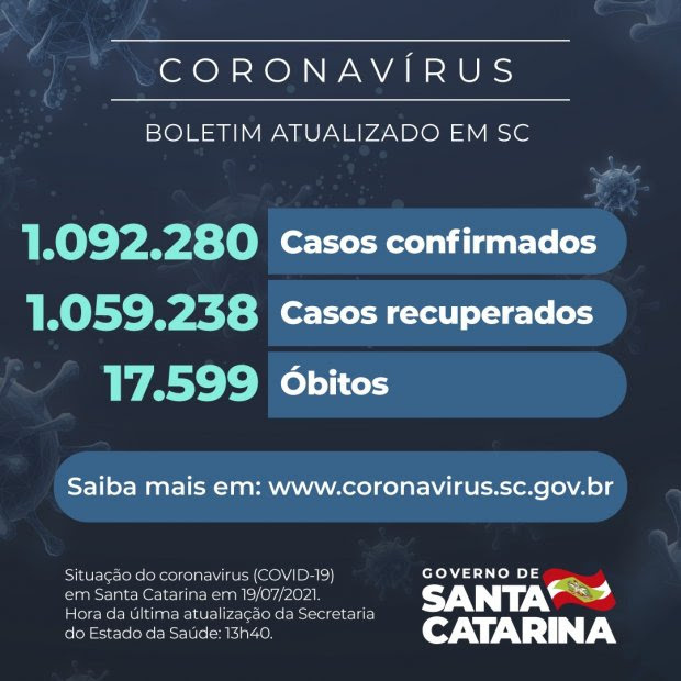 O Governo do Estado informou que há 1.092.280 casos confirmados de Covid-19 em Santa Catarina, sendo que 1.059.238 se recuperaram e 15.443 estão em acompanhamento. O número foi divulgado nesta segunda-feira, 19. Desde o início da pandemia, 17.599 óbitos foram causados pelo novo coronavírus. Esses números colocam a taxa de letalidade em 1,61%.