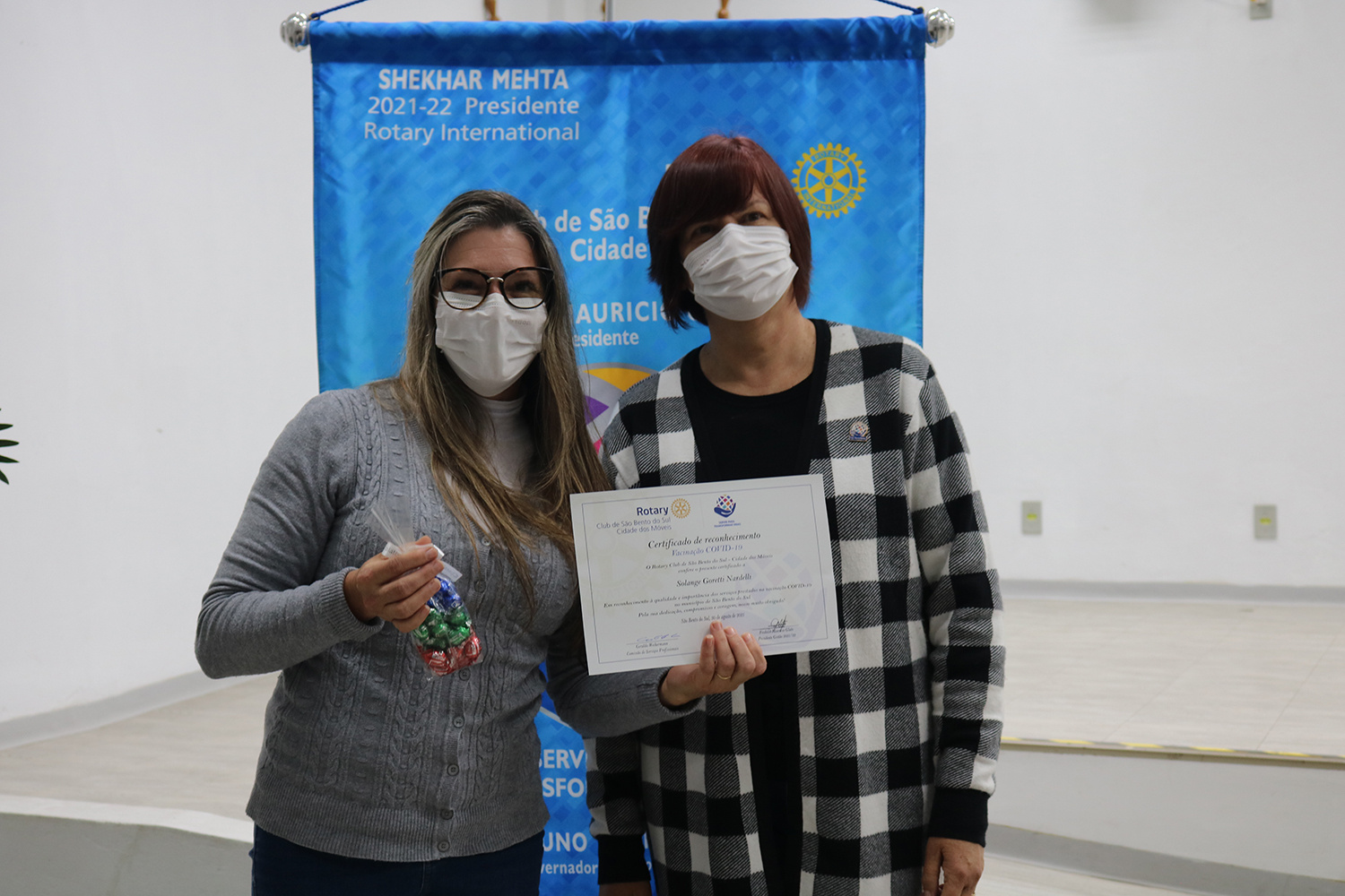 A homenagem ocorreu no auditório do Centro Administrativo Leopoldo Zschoerper e na oportunidade, integrantes do Rotary entregaram aos profissionais um certificado e uma lembrança a todos os presentes e também, aos que estavam atuando na vacinação no ginásio Annes Gualberto e no Centro de Vigilância à Saúde - CVS.