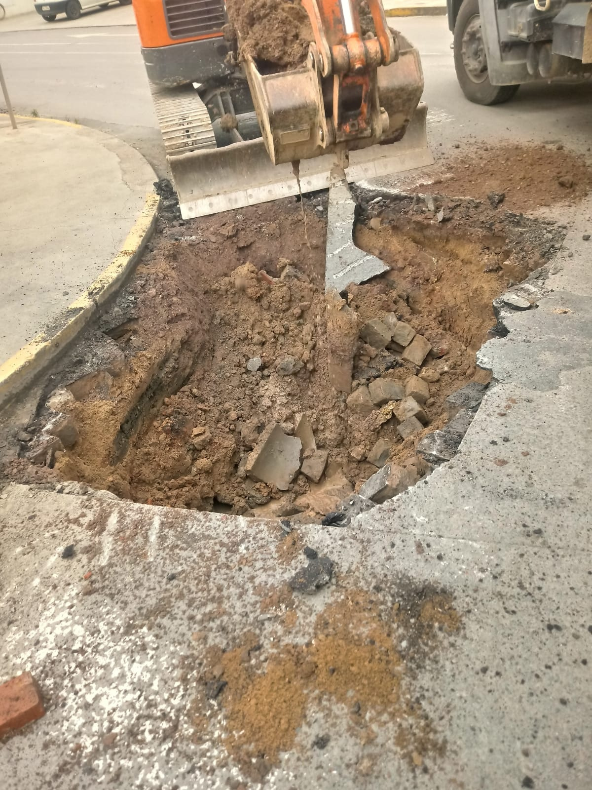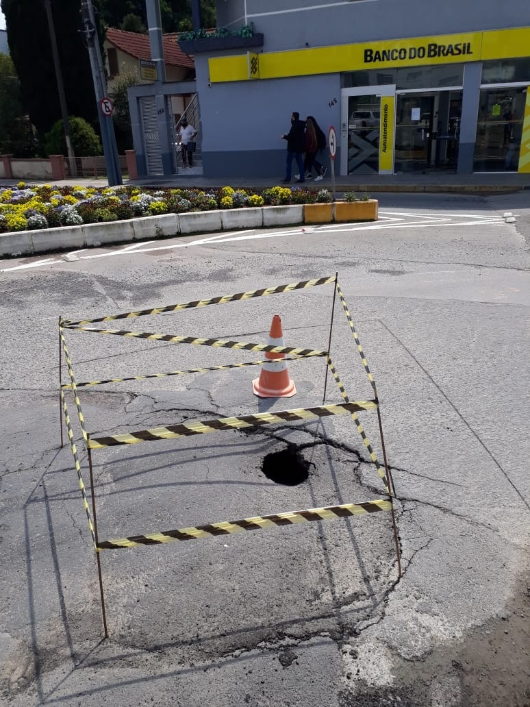 Nesta terça-feira (21), equipe da Secretaria de Obras está trabalhando na Rua Jorge Diener, no bairro Oxford, em frente ao Banco do Brasil, onde uma caixa morta (ligação subterrânea de tubos) não suportou o trânsito pesado e rompeu.
