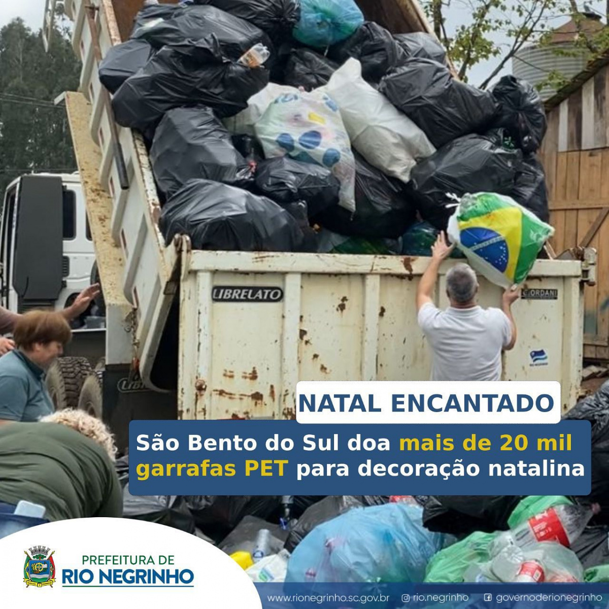 O Natal Encantado está chegando e para ajudar na decoração da nossa cidade recebemos um presente especial dos nossos vizinhos e amigos de São Bento do Sul: Mais de 20 mil garrafas PET. A arrecadação das garrafas foi realizada pelas equipes participantes da Gincana Tesouros de São Bento e doadas para a confecção dos nossos enfeites natalinos.