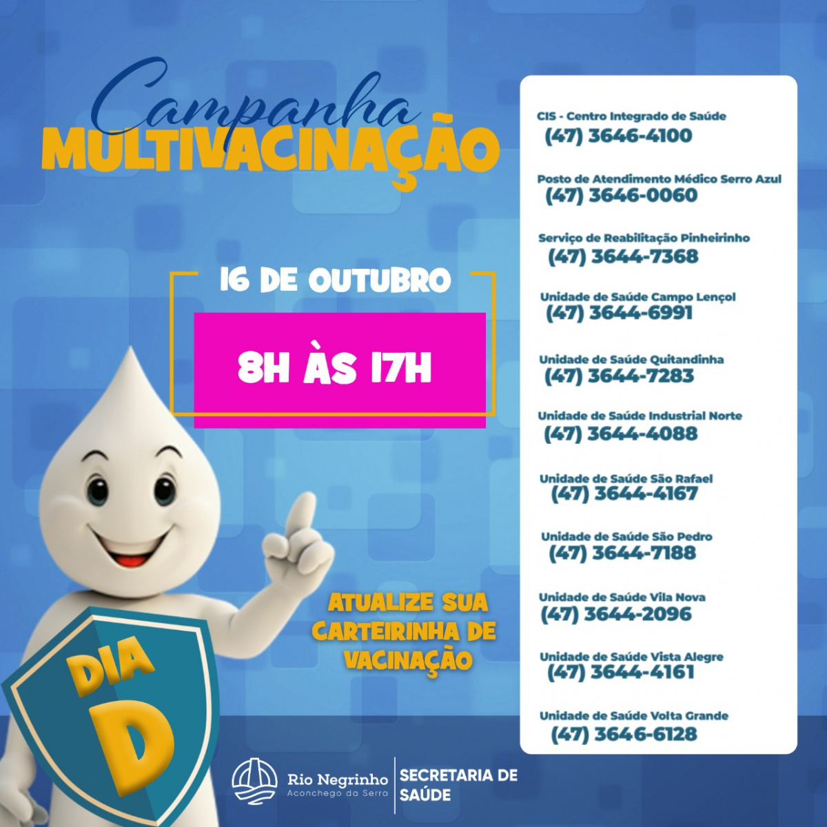 A Secretaria de Saúde de Rio Negrinho realiza neste sábado o DIA D para a multivacinação de crianças e adolescentes. Serão 11 postos de Saúde abertos das 8h às 17h para atualização da carteirinha de vacinação, sem fechar para o almoço!