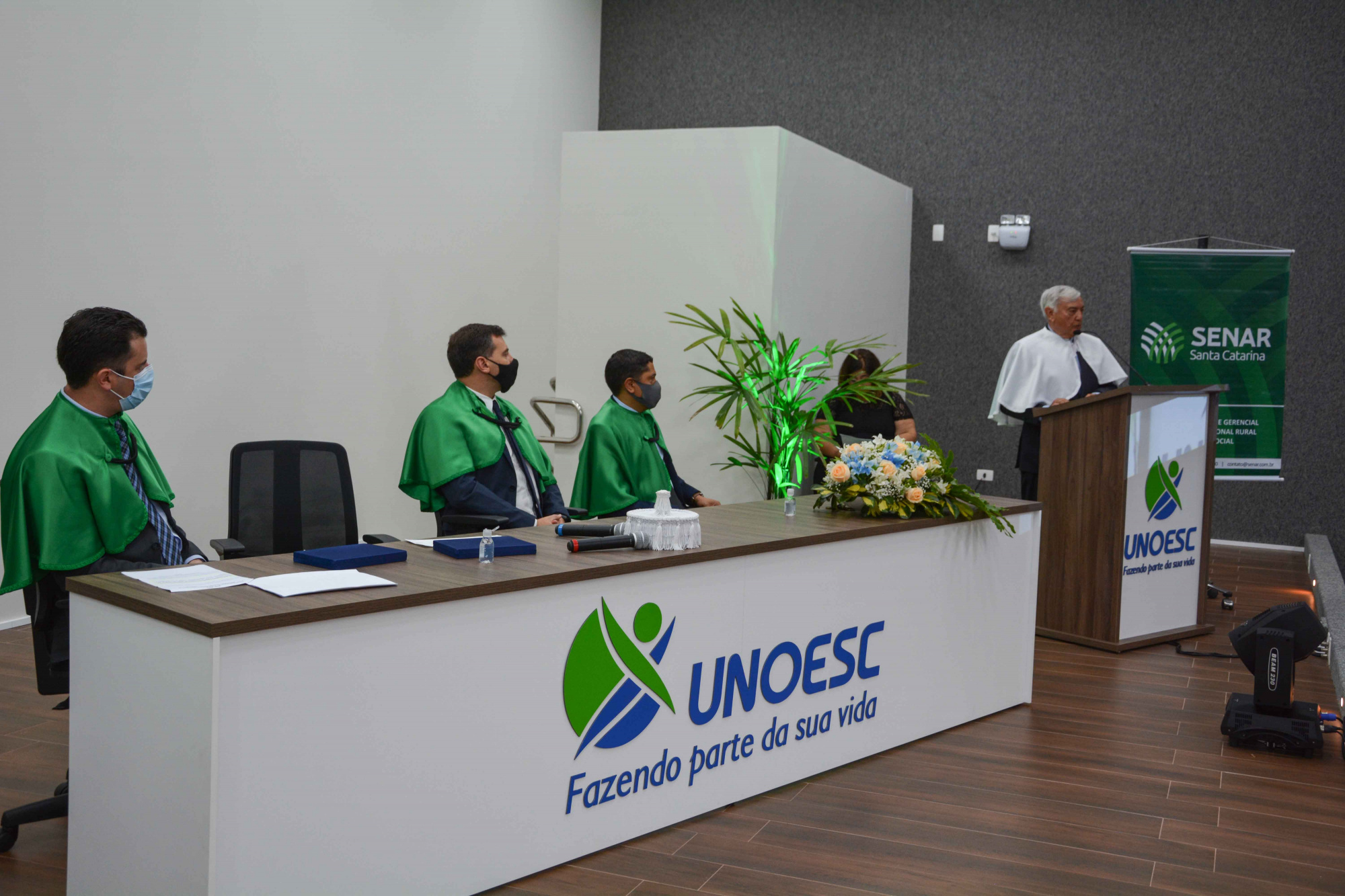 A solenidade de formatura, realizada no auditório da Unoesc, contou com a presença do presidente do Sistema FAESC/SENAR-SC José Zeferino Pedrozo, da coordenadora da Rede e-Tec do SENAR/SC Kátia Zanela, do presidente do Sindicato dos Produtores Rurais de Campos Novos Luiz Sérgio Gris Filho, do prefeito Silvio Alexandre Zancanaro, do presidente da Câmara de Vereadores Marciano Dalmolin, de representantes do Sistema FAESC/SENAR, professores e outras lideranças.
