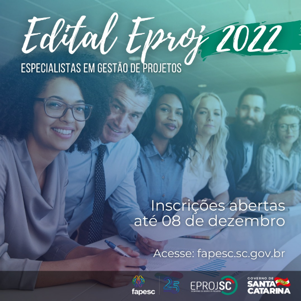 Foi aberto Edital de Chamada Pública FAPESC N 47/2021, em parceria com o Escritório de Gestão de Projetos de Santa Catarina (Eproj SC), para contratar 65 novos profissionais com conhecimento e/ou experiência em gestão de projetos, para atuarem no Executivo catarinense. Este é o terceiro Edital de Chamada Pública realizado pela Fundação de Amparo à Pesquisa e Inovação do Estado de Santa Catarina (Fapesc), em parceria com o EPROJ, consolidando a cultura de gerenciamento de projetos na administração pública estadual.