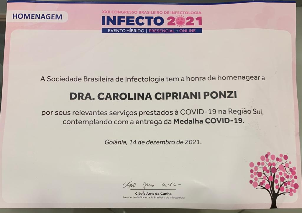 A médica infectologista Carolina Cipriani Ponzi, de Chapecó, recebeu homenagem nacional em reconhecimento ao seu trabalho desenvolvido durante a pandemia do novo coronavírus.