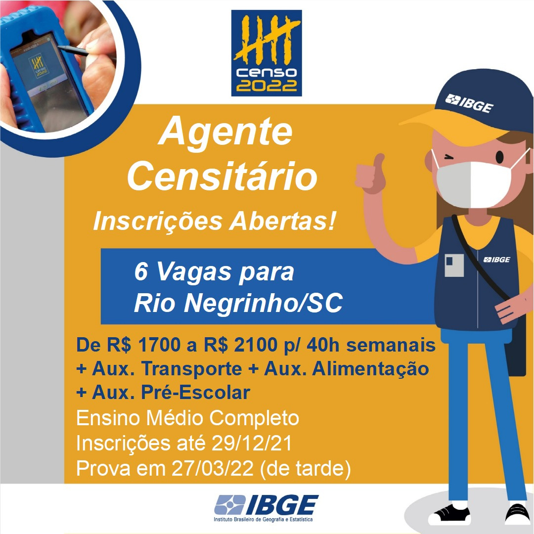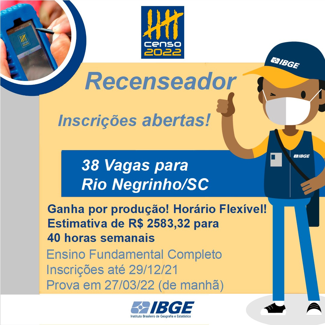 O IBGE abriu nesta quarta-feira as inscrições do processo seletivo para contratação de mais de 183 mil recenseadores que vão trabalhar na coleta de informações do Censo Demográfico 2022. Em Rio Negrinho são 38 vagas para Recenseador e seis para Agente Censitário.