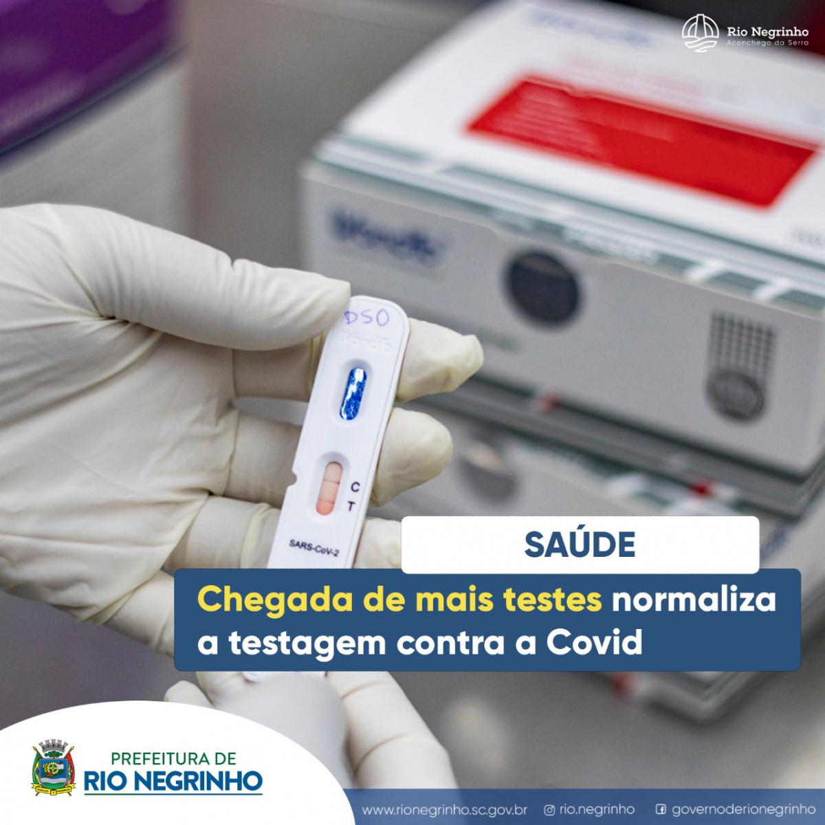 A Secretaria de Saúde de Rio Negrinho informa que recebeu nesta manhã novas unidades de testes para Covid-19. Com esta nova remessa do Governo do Estado, a testagem volta a ser ampliada para todos os pacientes que estiverem com sintomas da doença há mais de três dias.