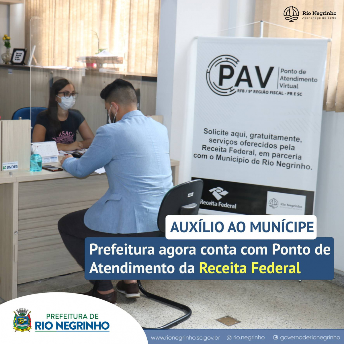 Agora a comunidade rio-negrinhense pode contar com mais um suporte para resolução de serviços! Já está em funcionamento o Ponto de Atendimento Virtual da Receita Federal em Rio Negrinho. O PAV está situado dentro da Prefeitura Municipal e conta com mais de 10 tipos de serviços para auxiliar os munícipes, como consultas de pendência fiscal, declarações de recibos e etc.