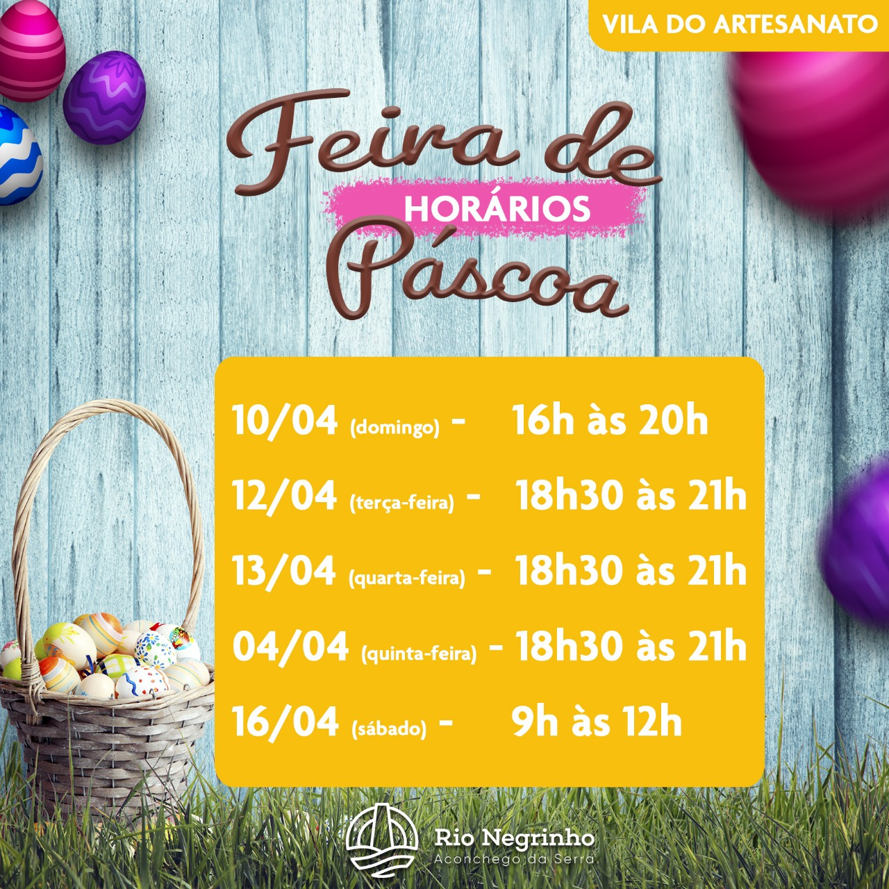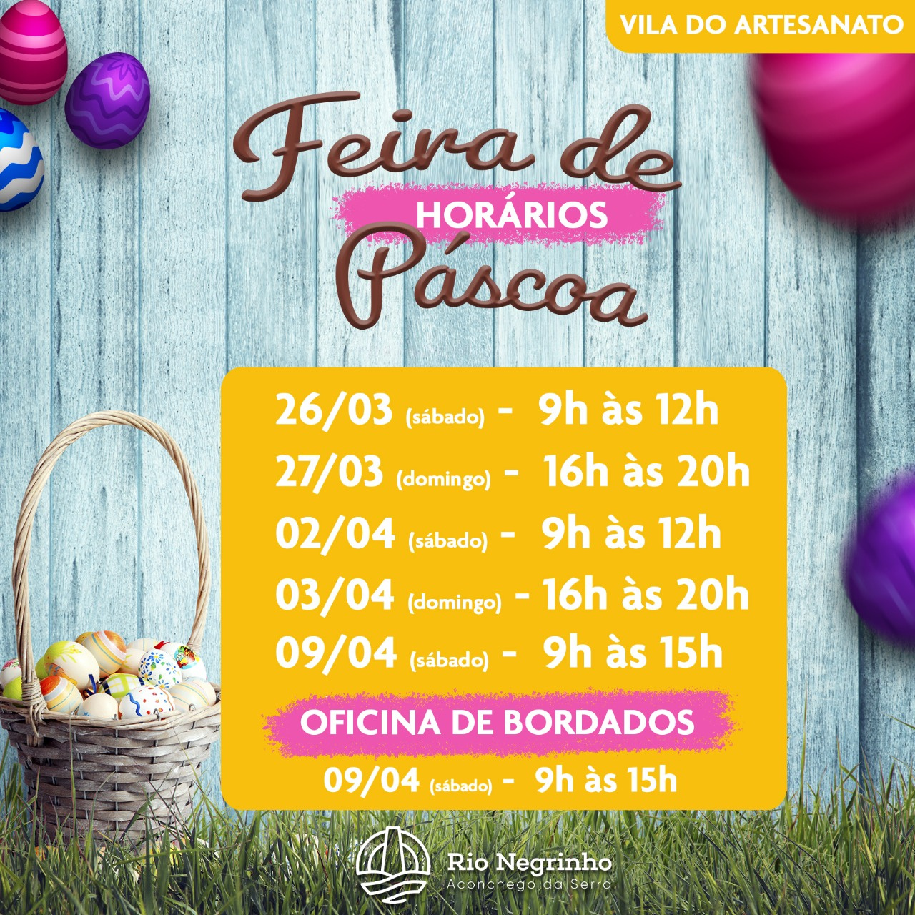 A Associação Vila do Artesanato, em parceria com a Fundação Municipal de Cultura, inicia no próximo dia 26 de março uma Feira de Páscoa no centro de Rio Negrinho. A feira acontecerá na Vila do Artesanato, ao lado do terminal urbano, com venda de produtos feitos pelos nossos artesãos.